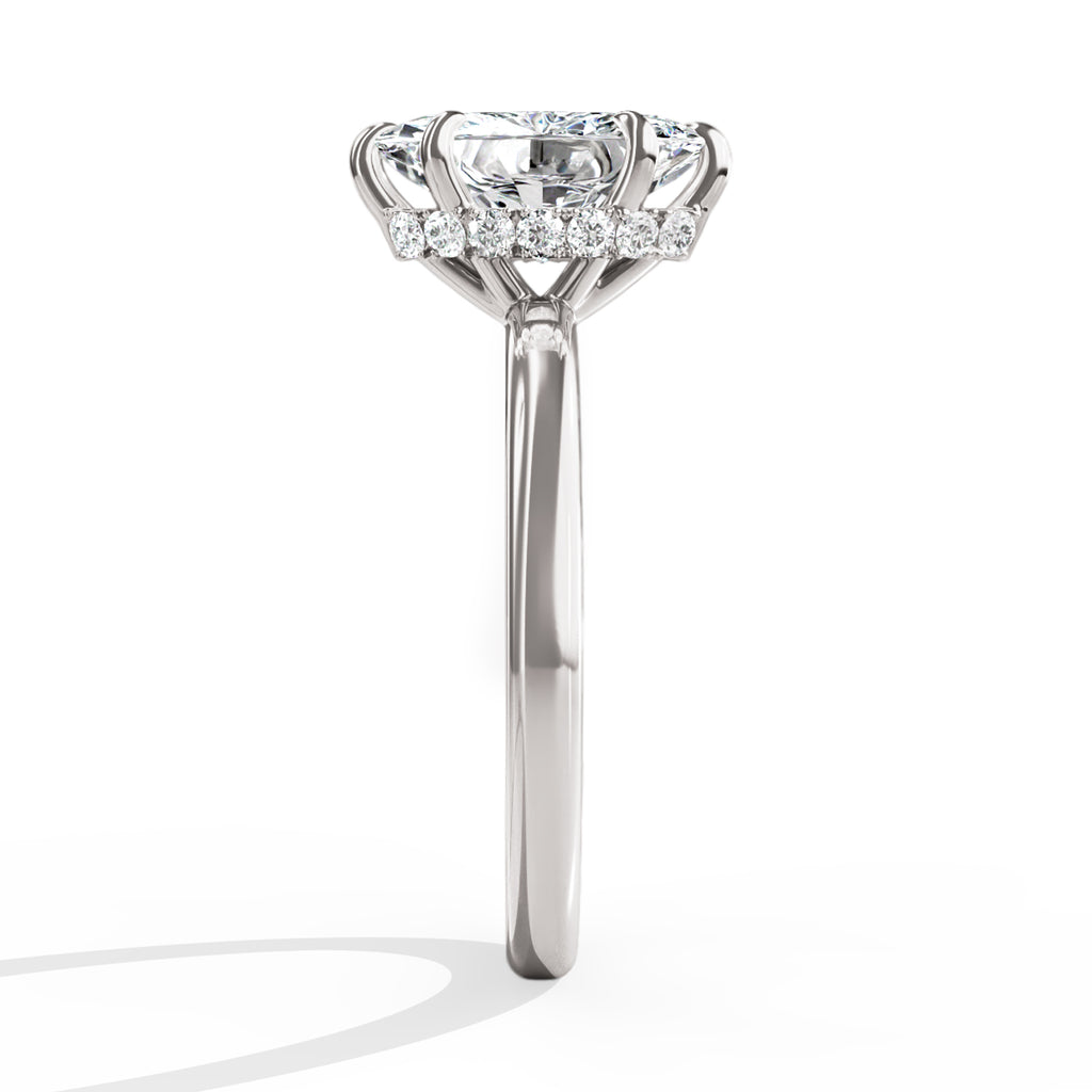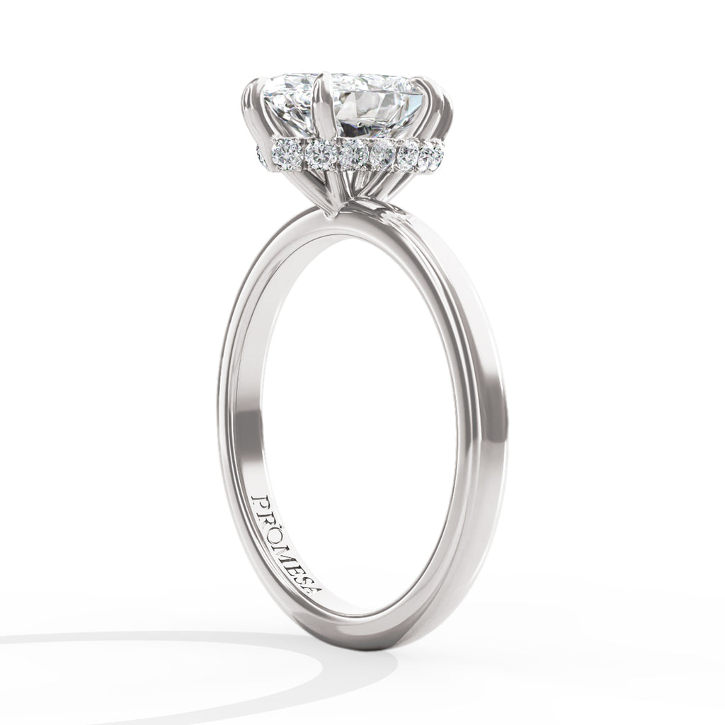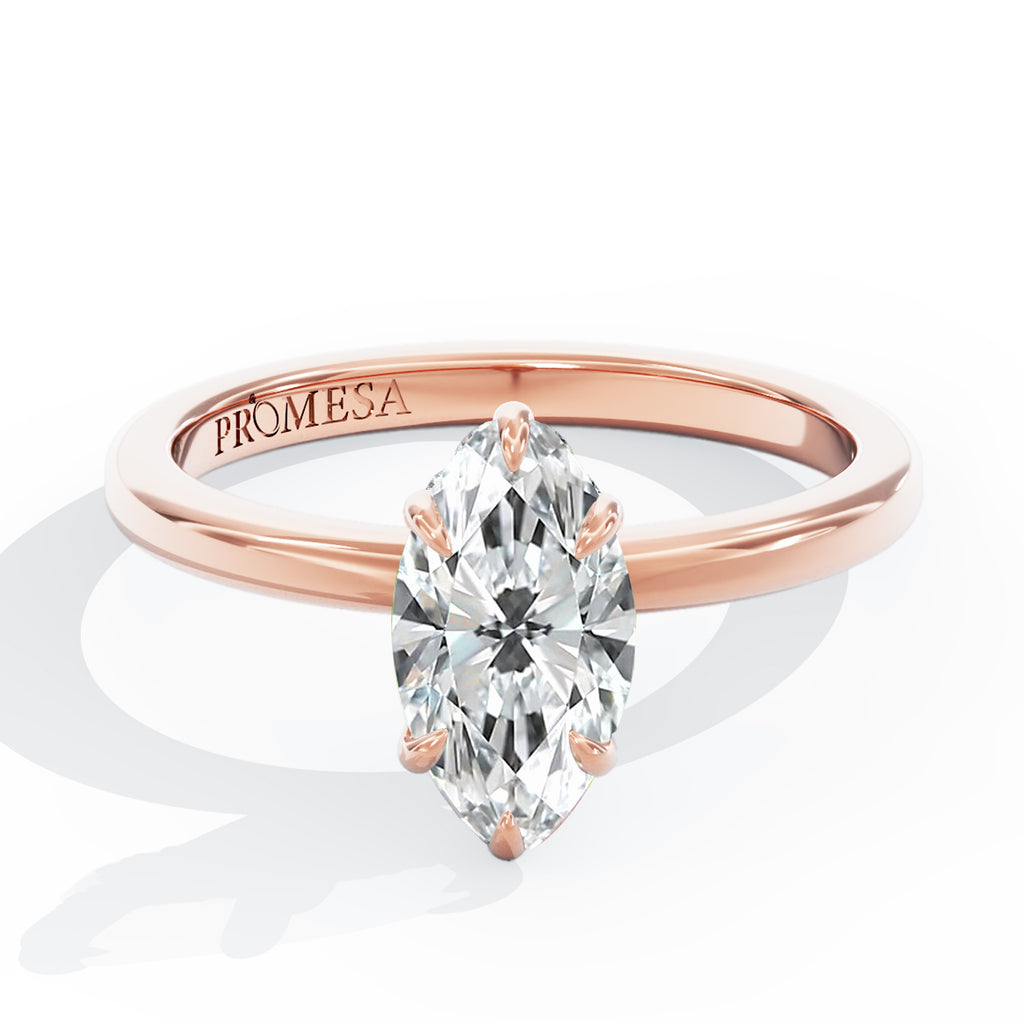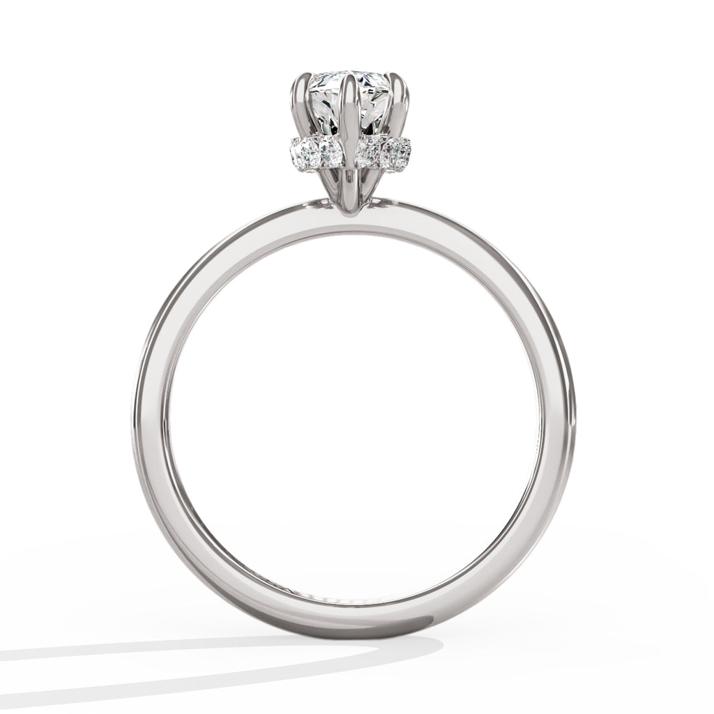 Un solitario con piedra marquesa, alargada y sofisticada, montada sobre una corona elevada con halo escondido: un detalle secreto que no solo añade luz y complejidad, sino estructura y seguridad. Las uñas se refuerzan con esta base discreta, haciendo que la piedra se sienta tan firme como significativa.