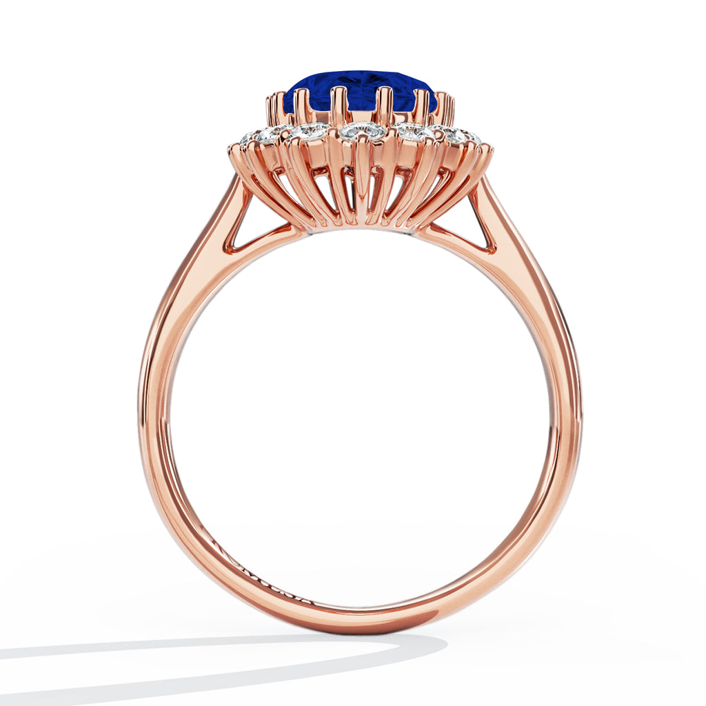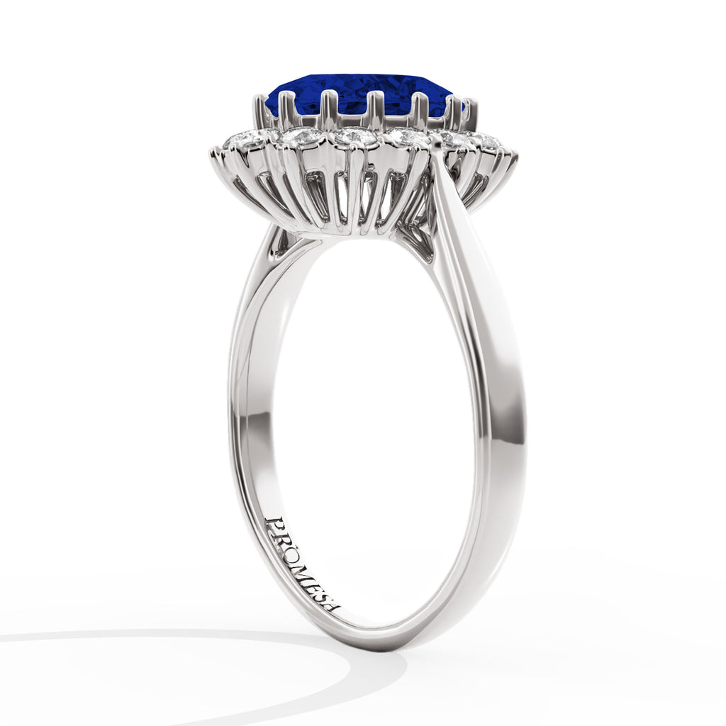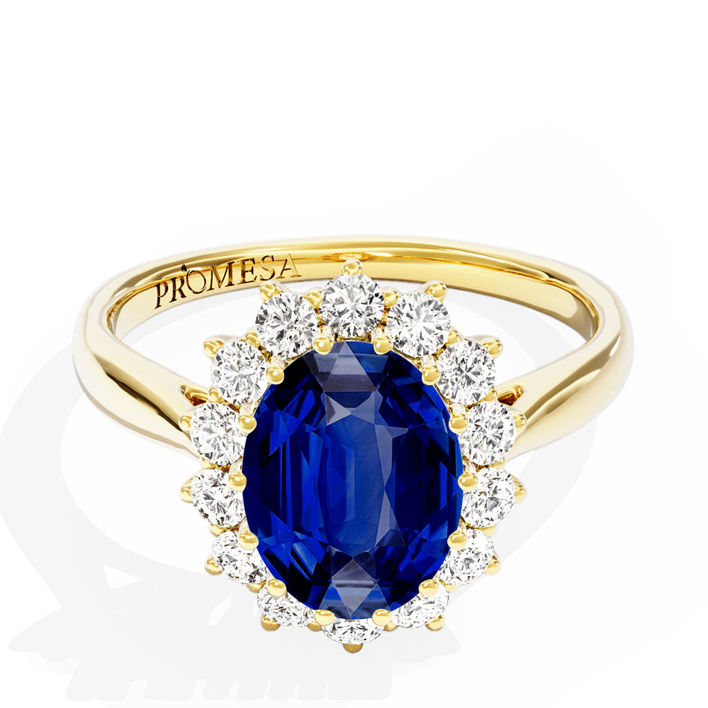 El anillo Princesa Diana rinde homenaje a la realeza con una silueta que ha trascendido el tiempo. La piedra central, un zafiro oval de laboratorio, se alza como protagonista indiscutible, rodeada por un halo de gemas que evocan la majestuosidad de una corona.