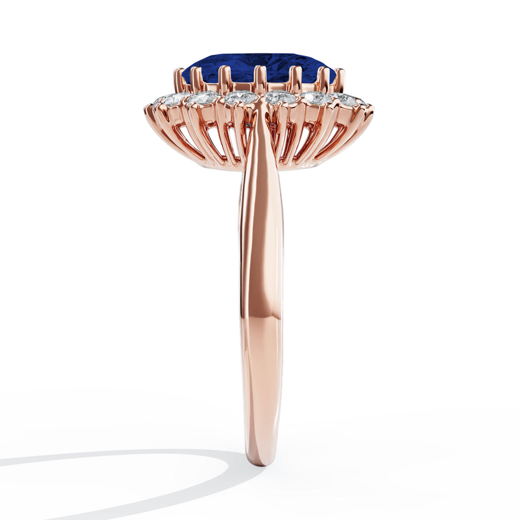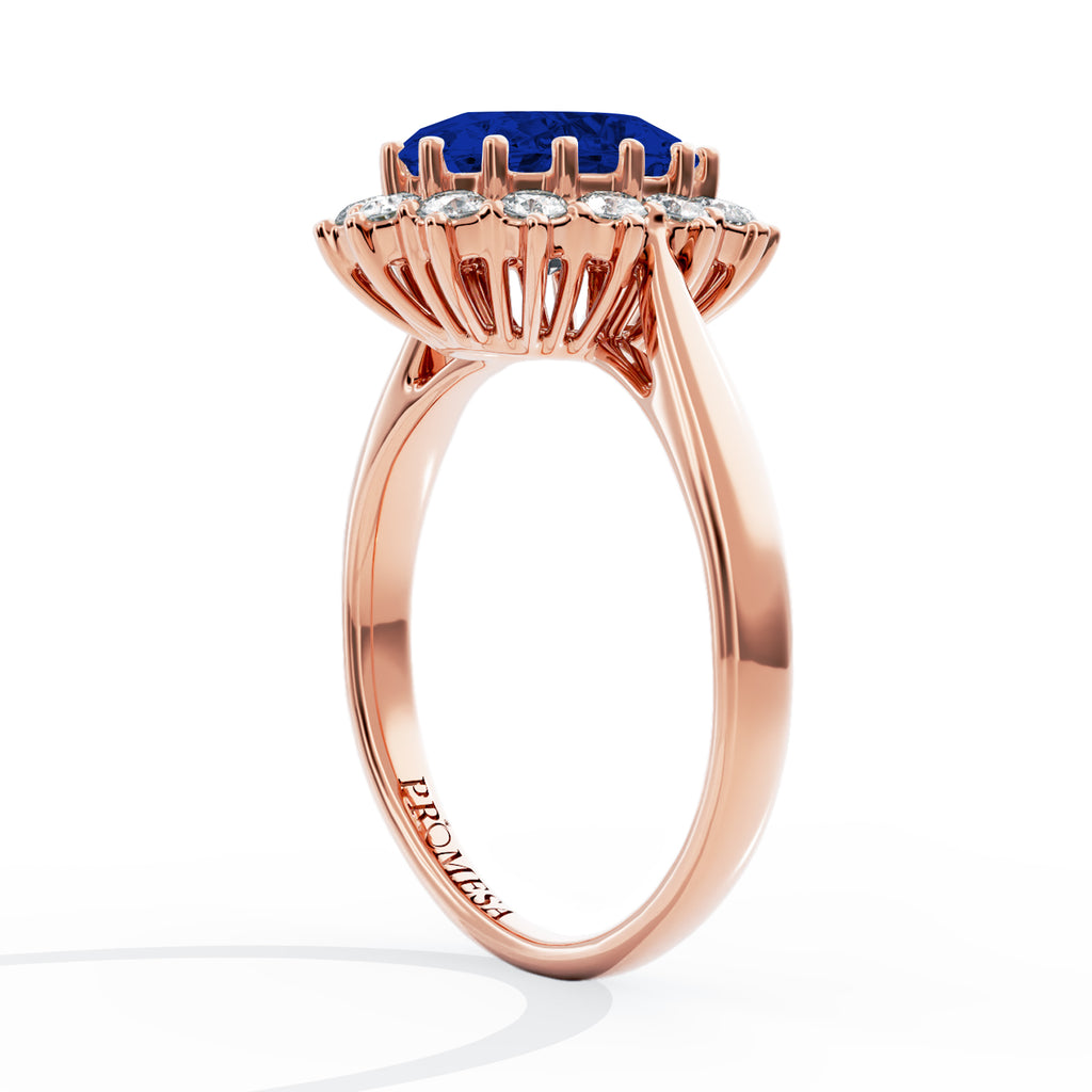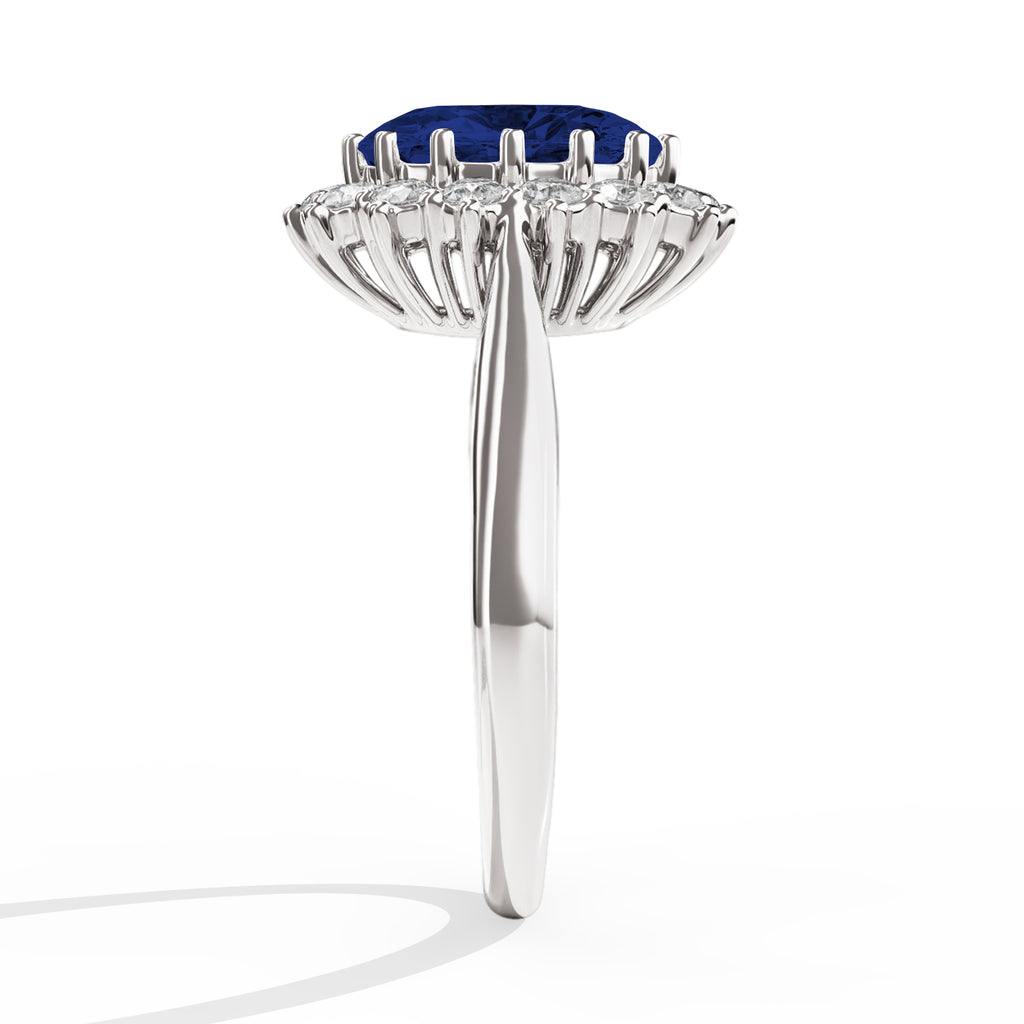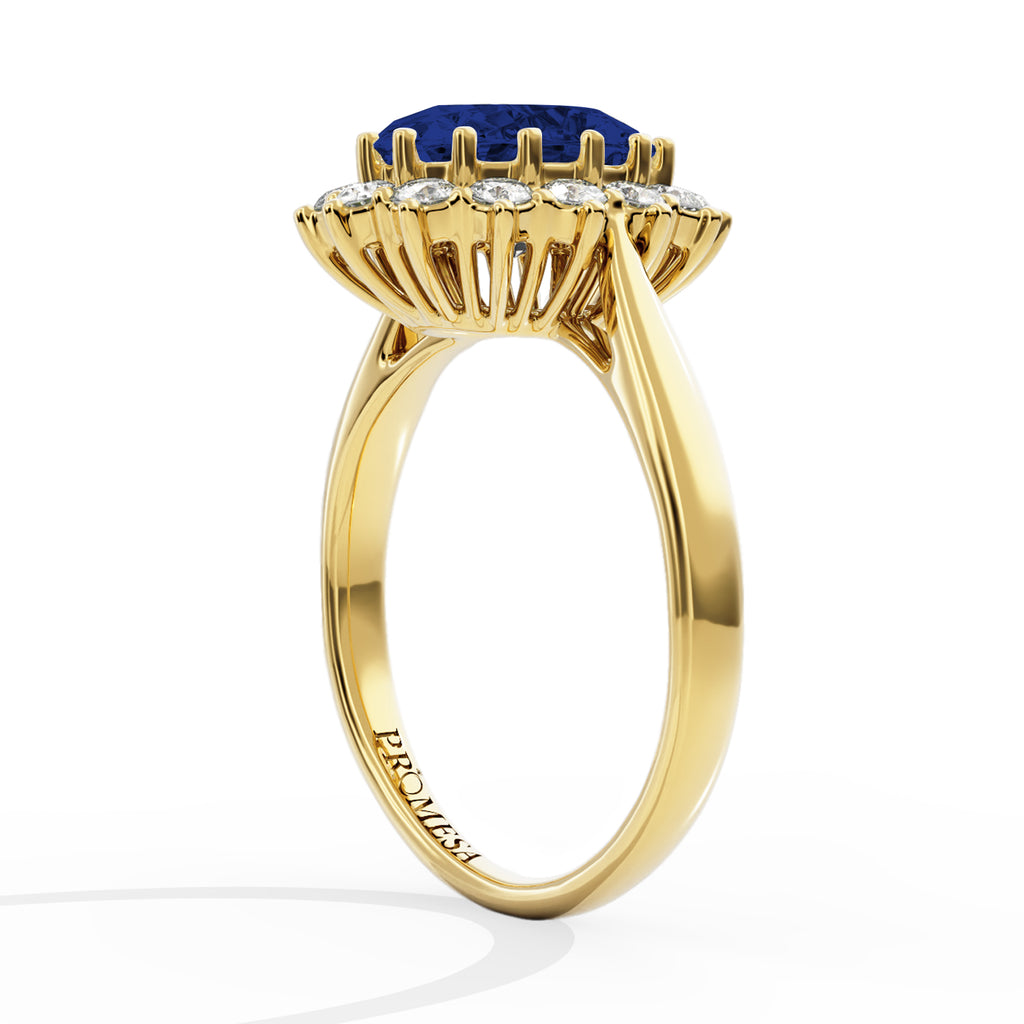 El anillo Princesa Diana rinde homenaje a la realeza con una silueta que ha trascendido el tiempo. La piedra central, un zafiro oval de laboratorio, se alza como protagonista indiscutible, rodeada por un halo de gemas que evocan la majestuosidad de una corona.