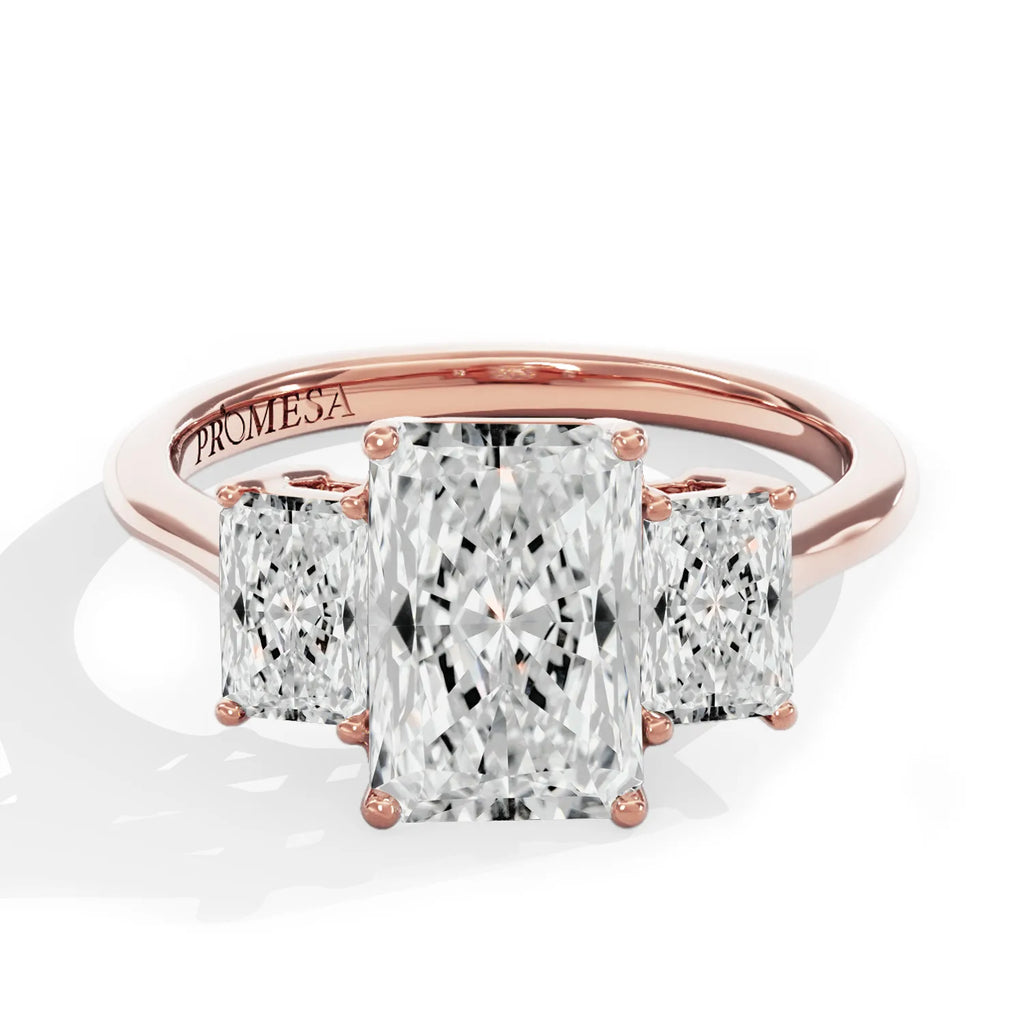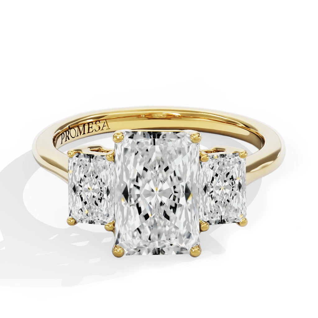 Cada piedra habla; la central, más grande, representa el amor presente, mientras que las laterales evocan los recuerdos compartidos y los sueños por venir. El corte radiante, con su fusión de brillo intenso y silueta rectangular, cuenta esta historia con una energía vibrante y sofisticada.